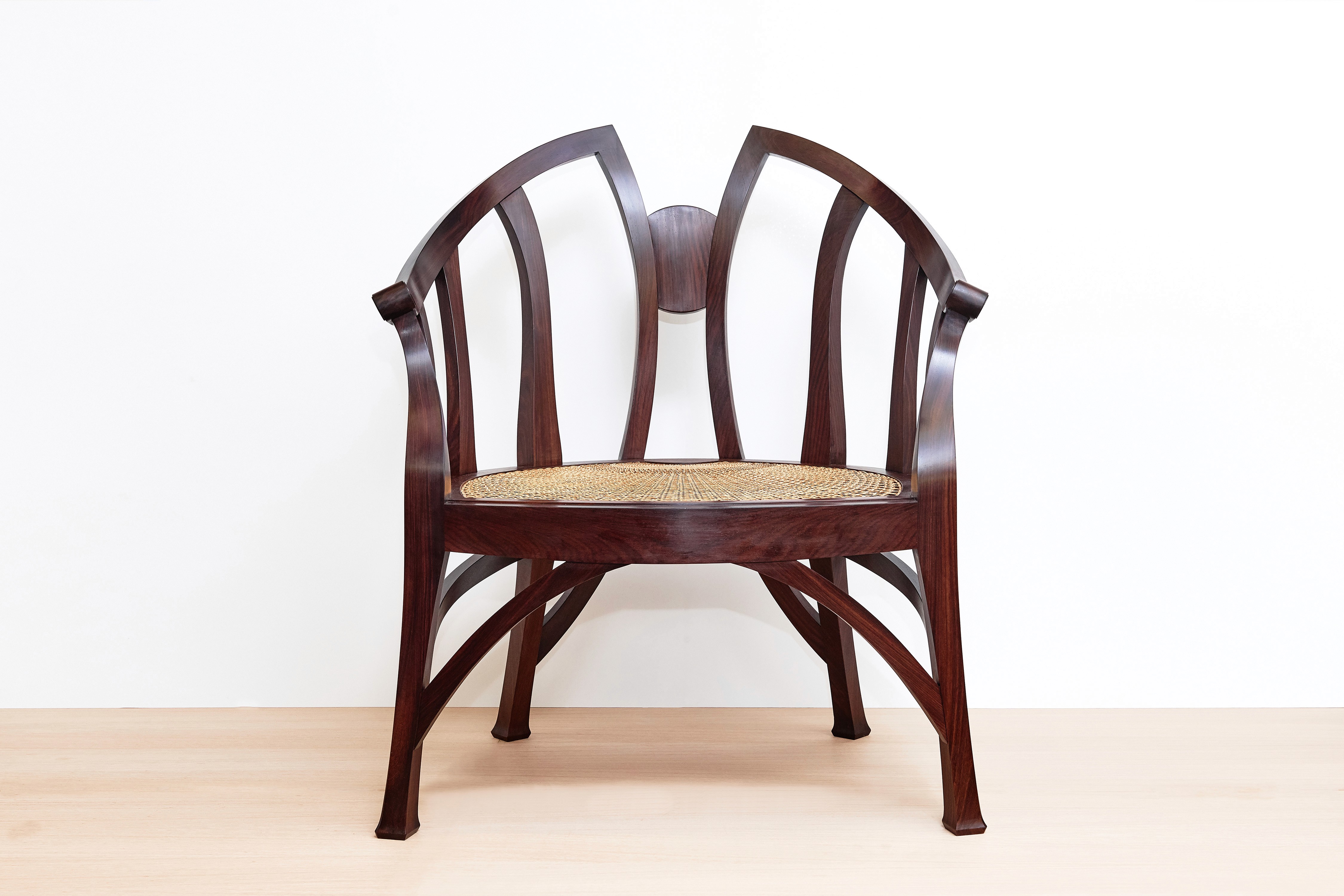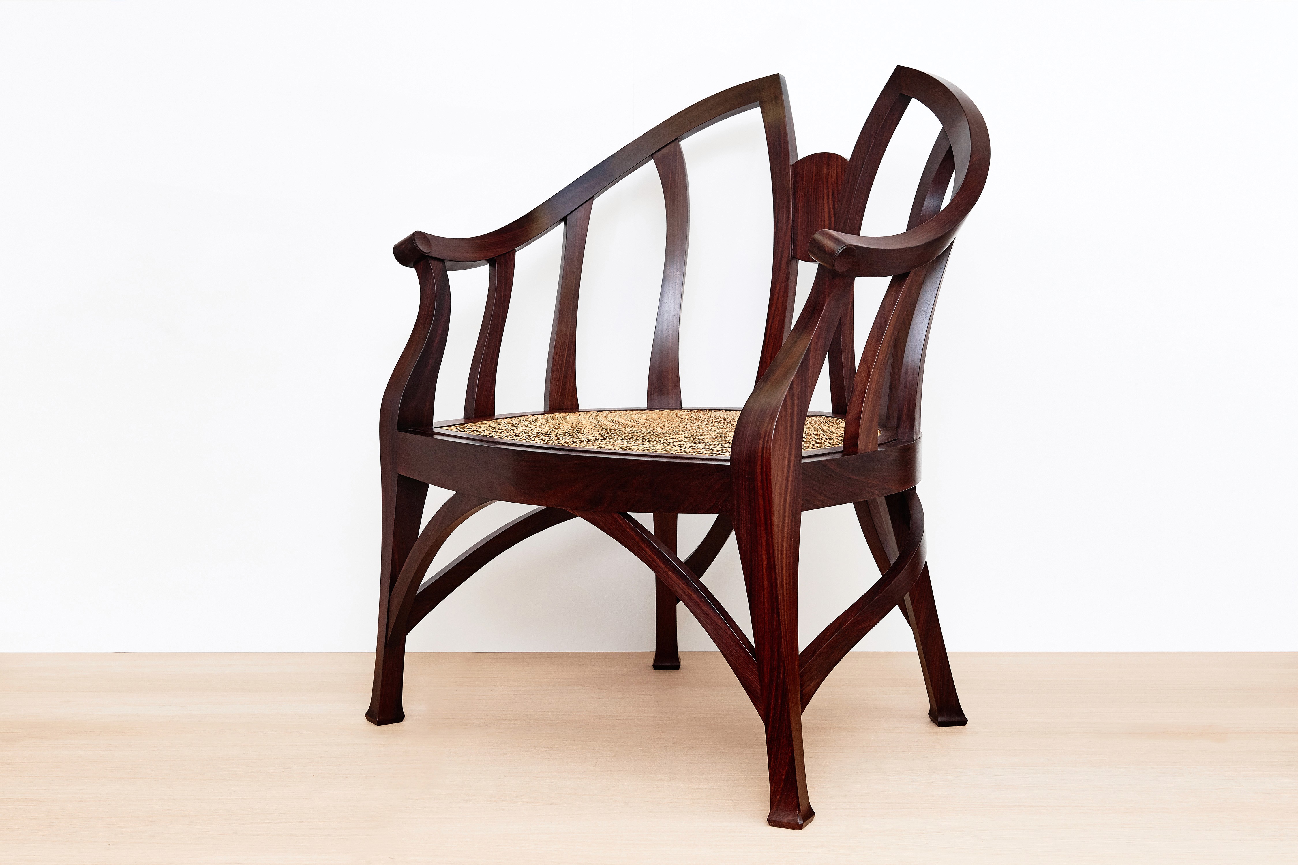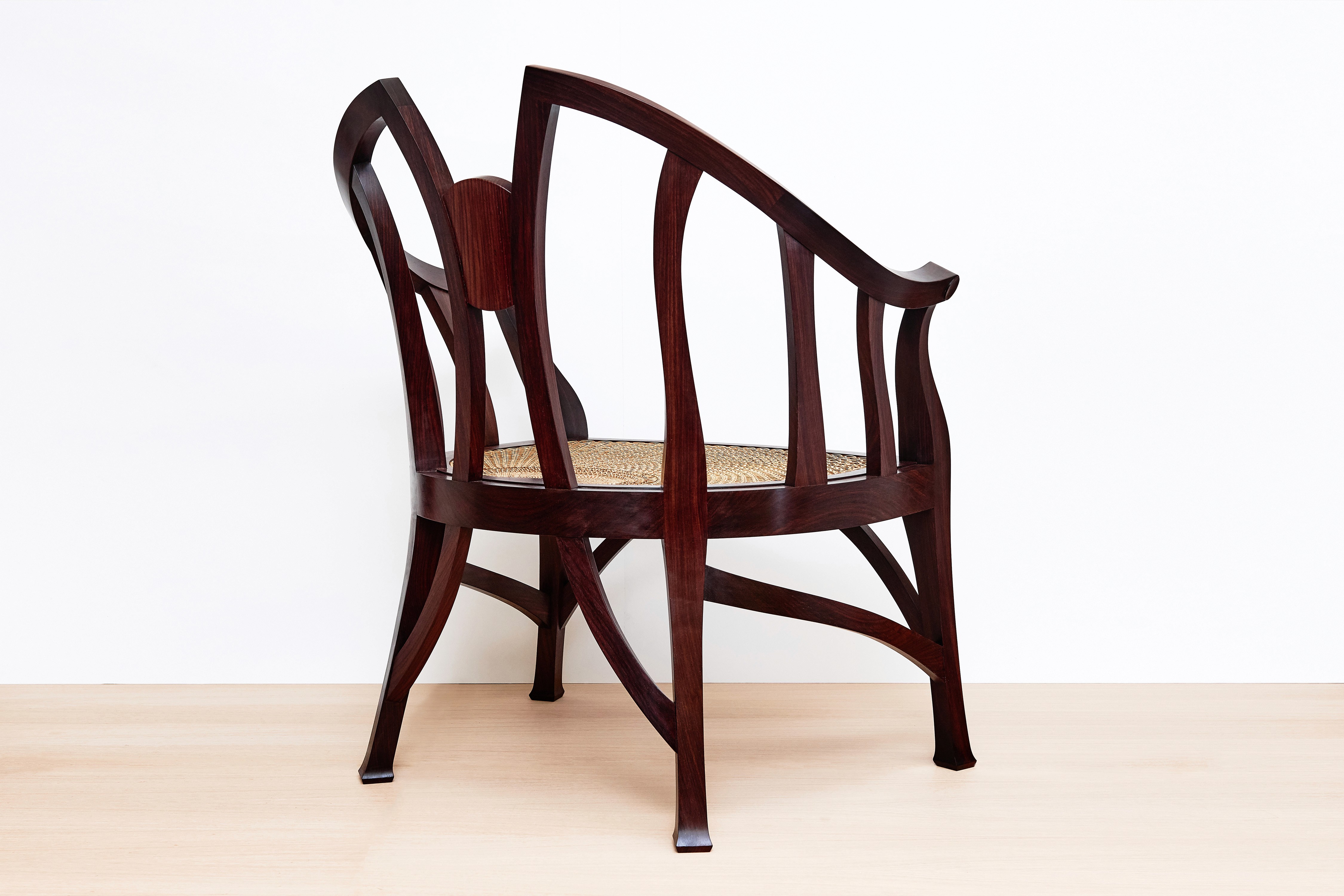 Les lignes de ce fauteuil en palissandre des Indes sont inspirées par la faune et la flore de la Mangrove. Le cannage en rotin est réalisé en éventail et a été sous-traité à la Maison Galli; 900 heures ont été nécessaires pour la réalisation de cette œuvre.