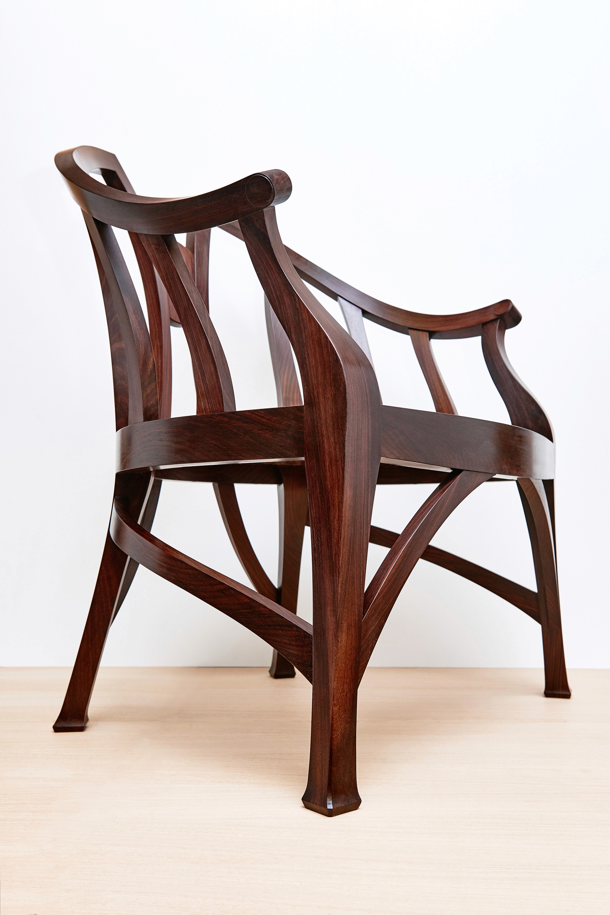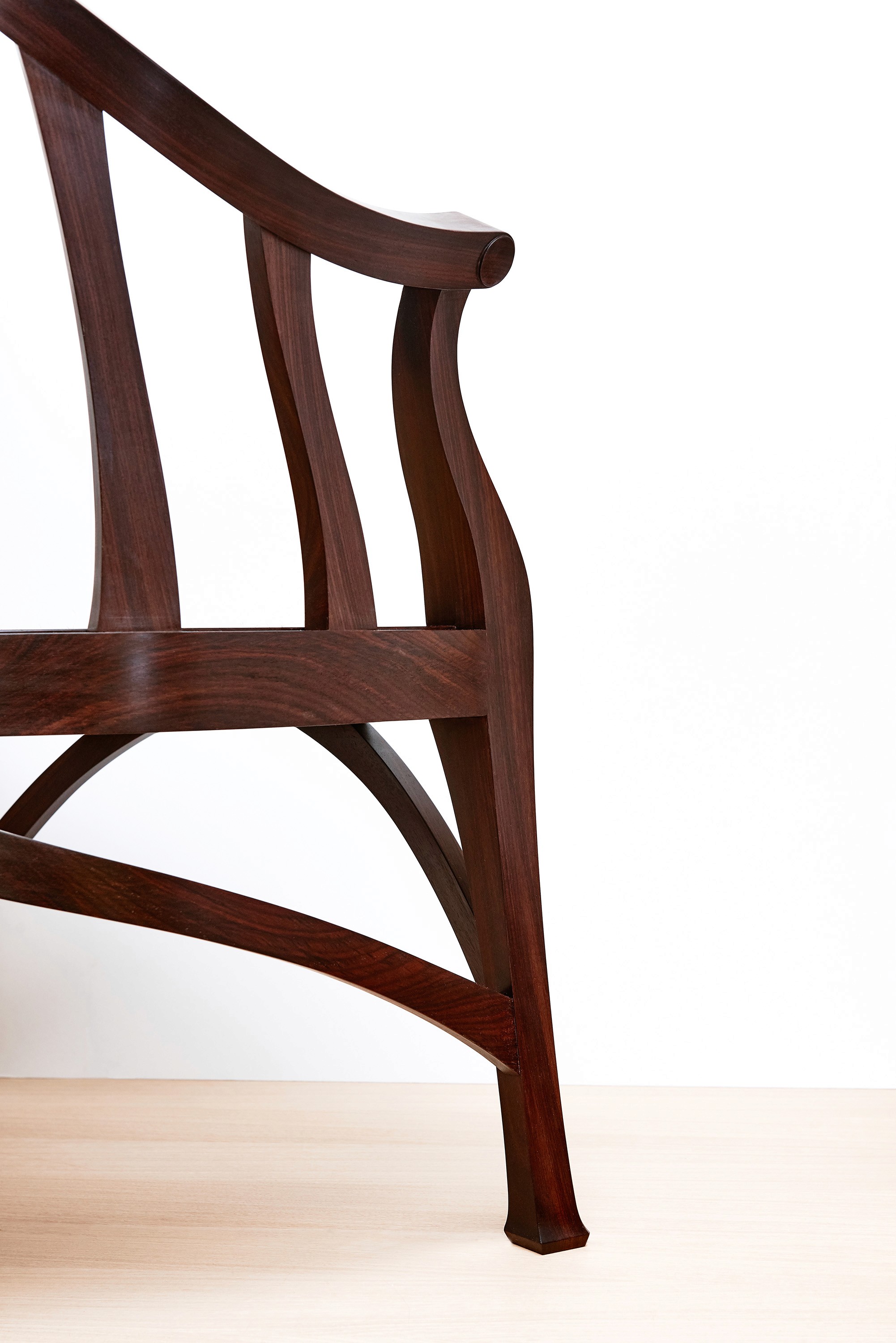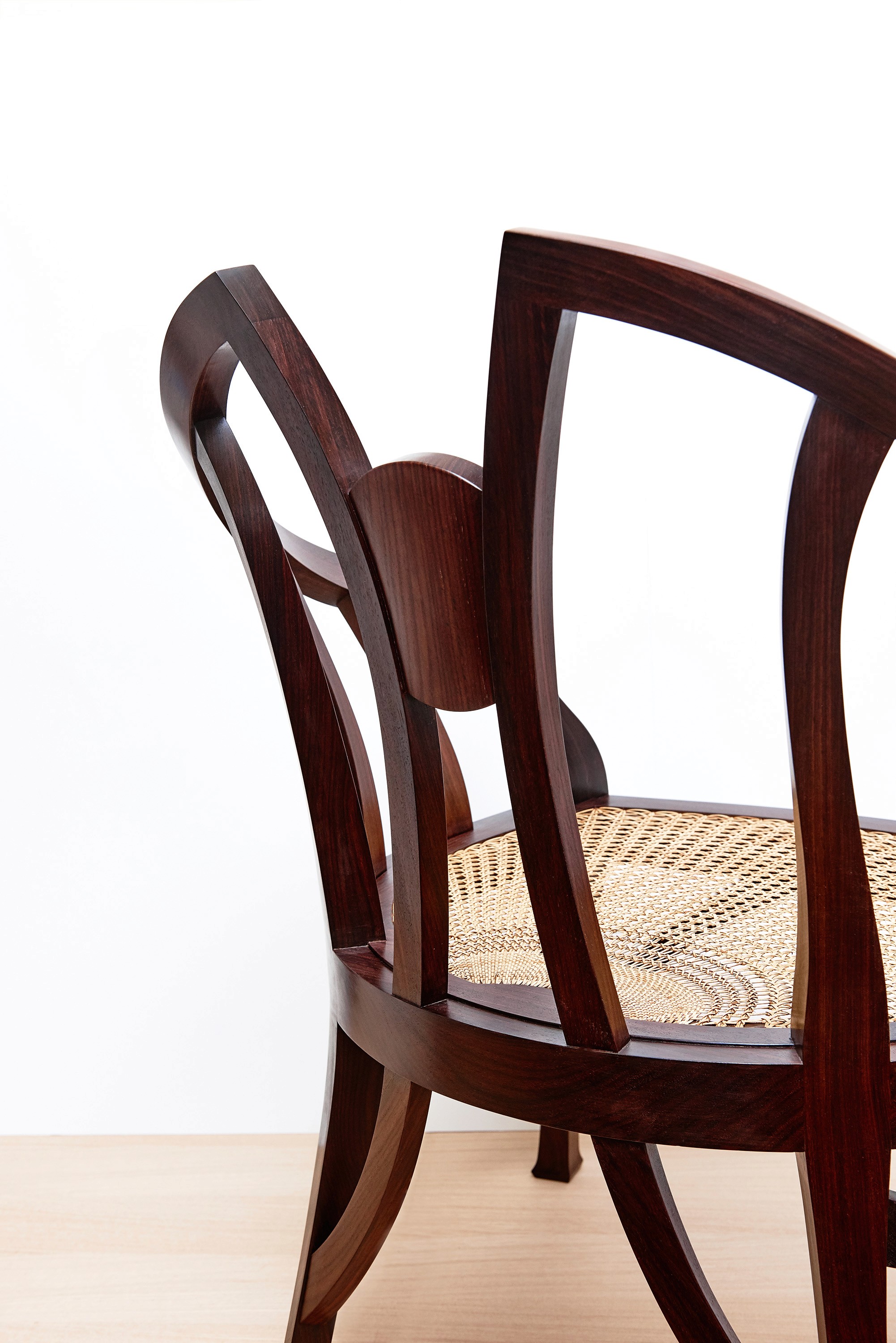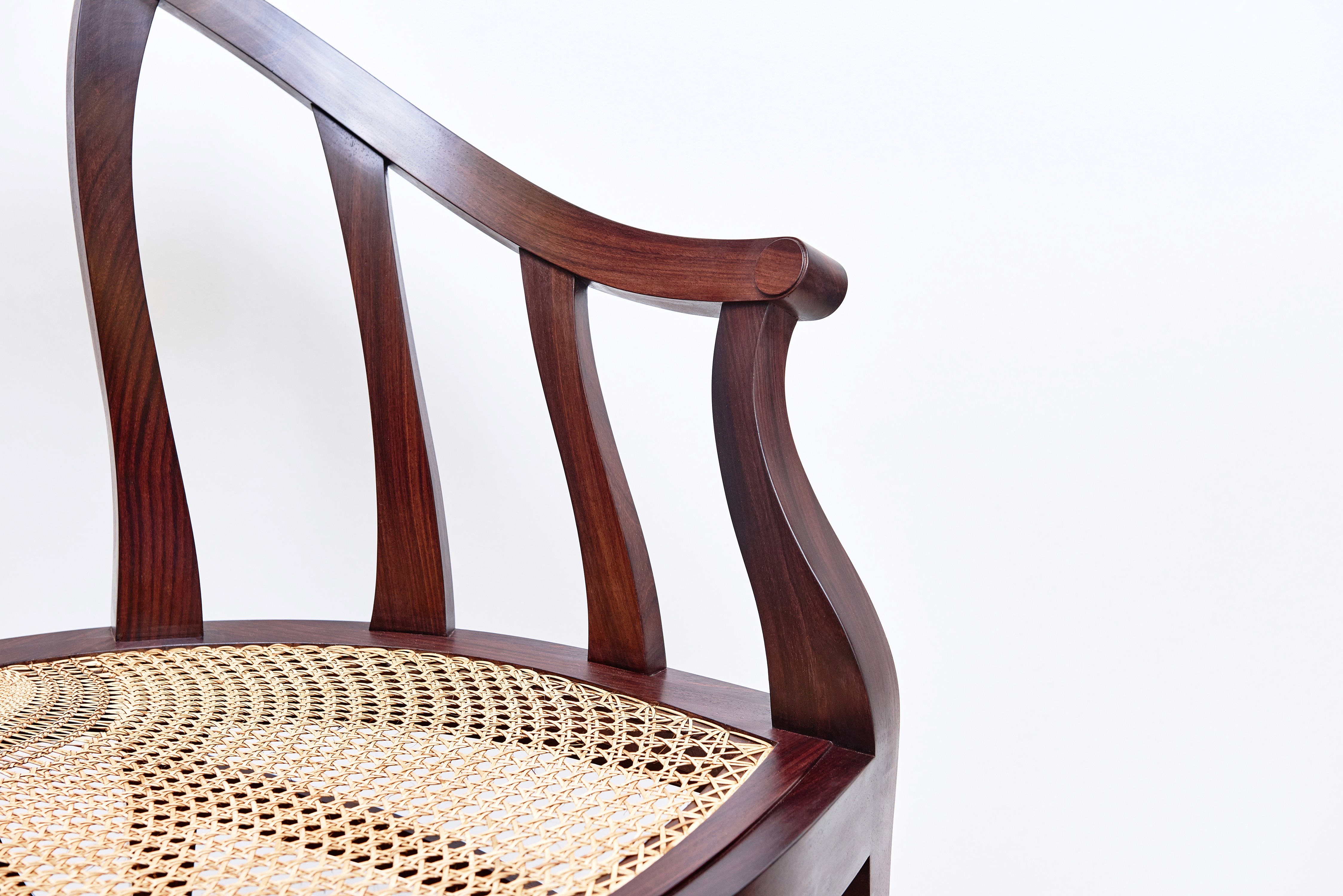 Les lignes de ce fauteuil en palissandre des Indes sont inspirées par la faune et la flore de la Mangrove. Le cannage en rotin est réalisé en éventail et a été sous-traité à la Maison Galli; 900 heures ont été nécessaires pour la réalisation de cette œuvre.